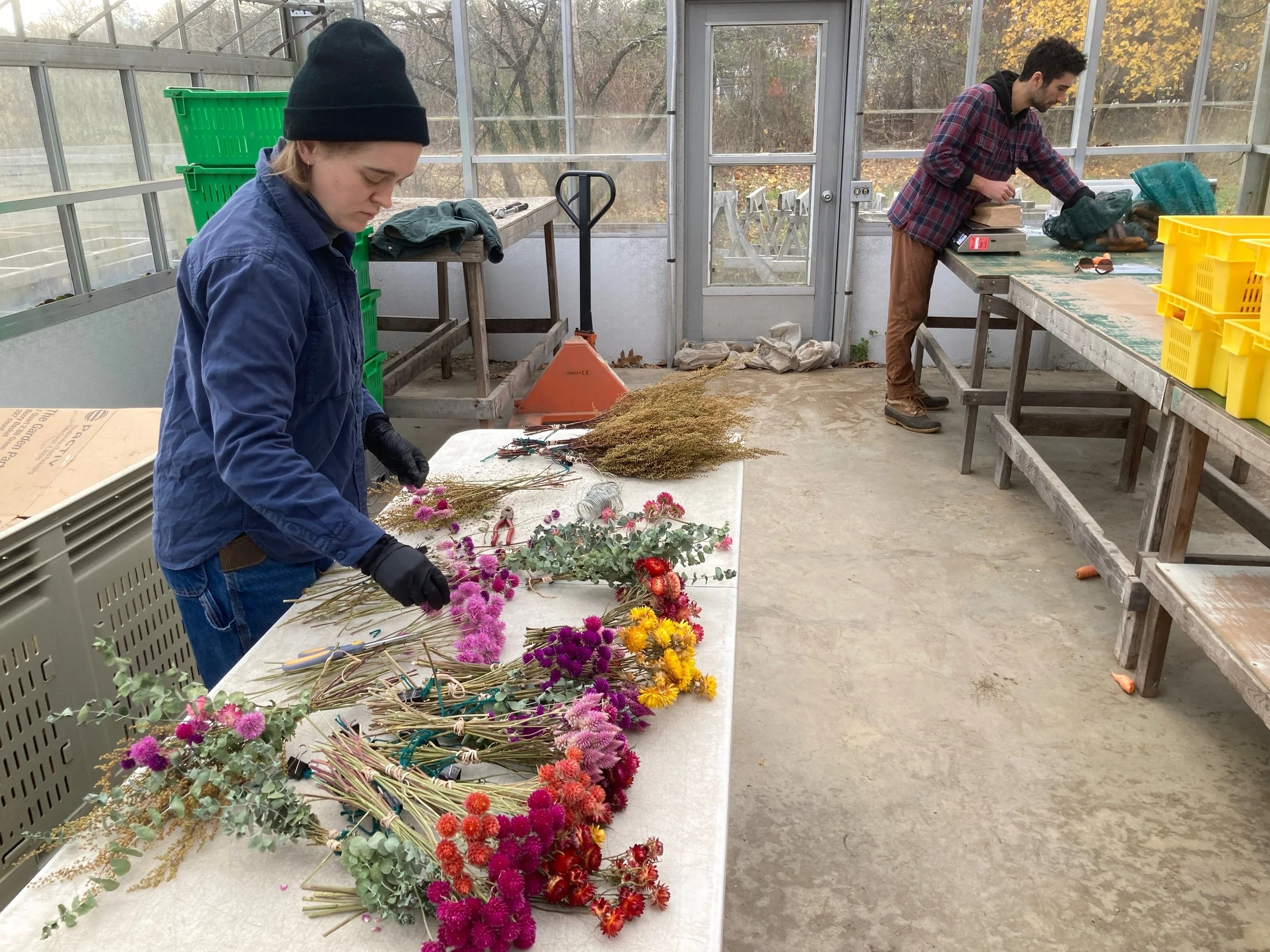 Catherine working on dried flower hangings while Joe bags popcorn. It was a festive fall greenhouse morning!
