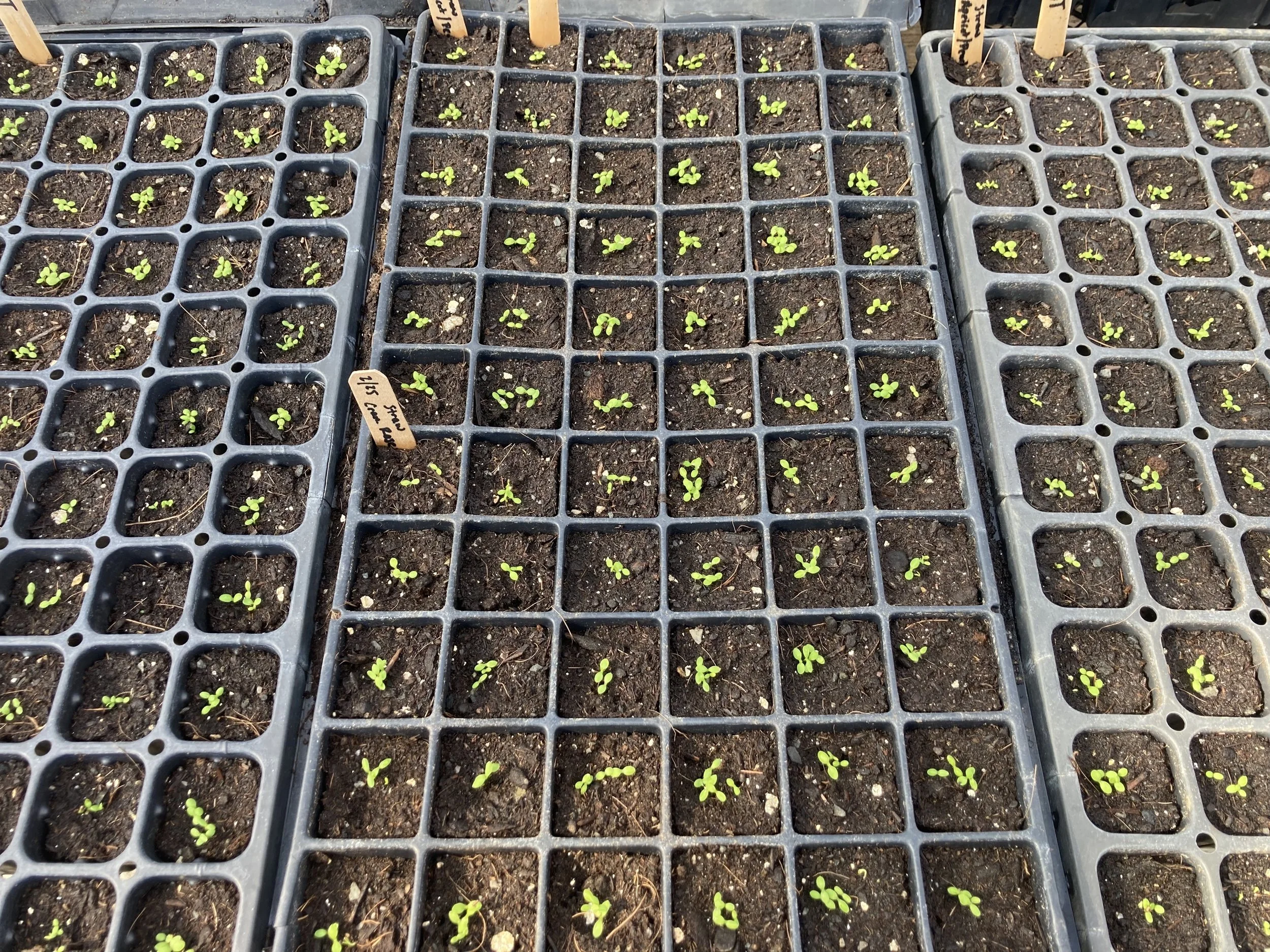 Strawflower that just germinated on our heat mats. We are excited about a new planting of spring flowers this year for earlier mixed bouquets in the farm stand!