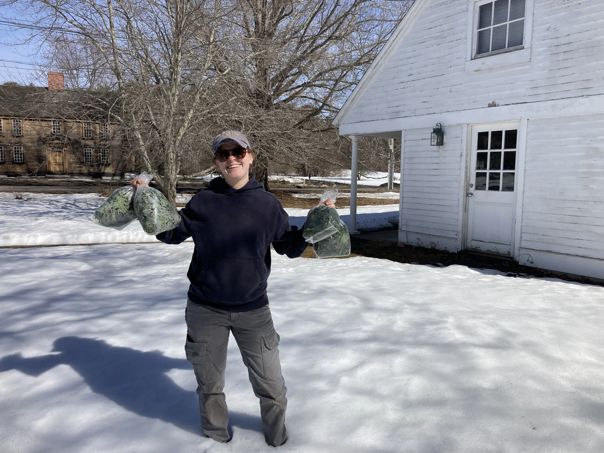 We will be open for our pop-up sale tomorrow, Saturday from 10am-Noon! The great news is it was an even better harvest than we expected and so we have plenty of kale mix and spinach for all (no limits)! The challenge for tomorrow will be parking as we still have a lot of snow in our parking area. Some patience and good footwear may be required in the parking area but perseverance will be rewarded with abundant produce. We will have special guest Debbie running a second check-out desk to keep the parking spaces turning over and Maddie will be here re-stocking throughout the morning. See below for a complete list of what will be for sale!