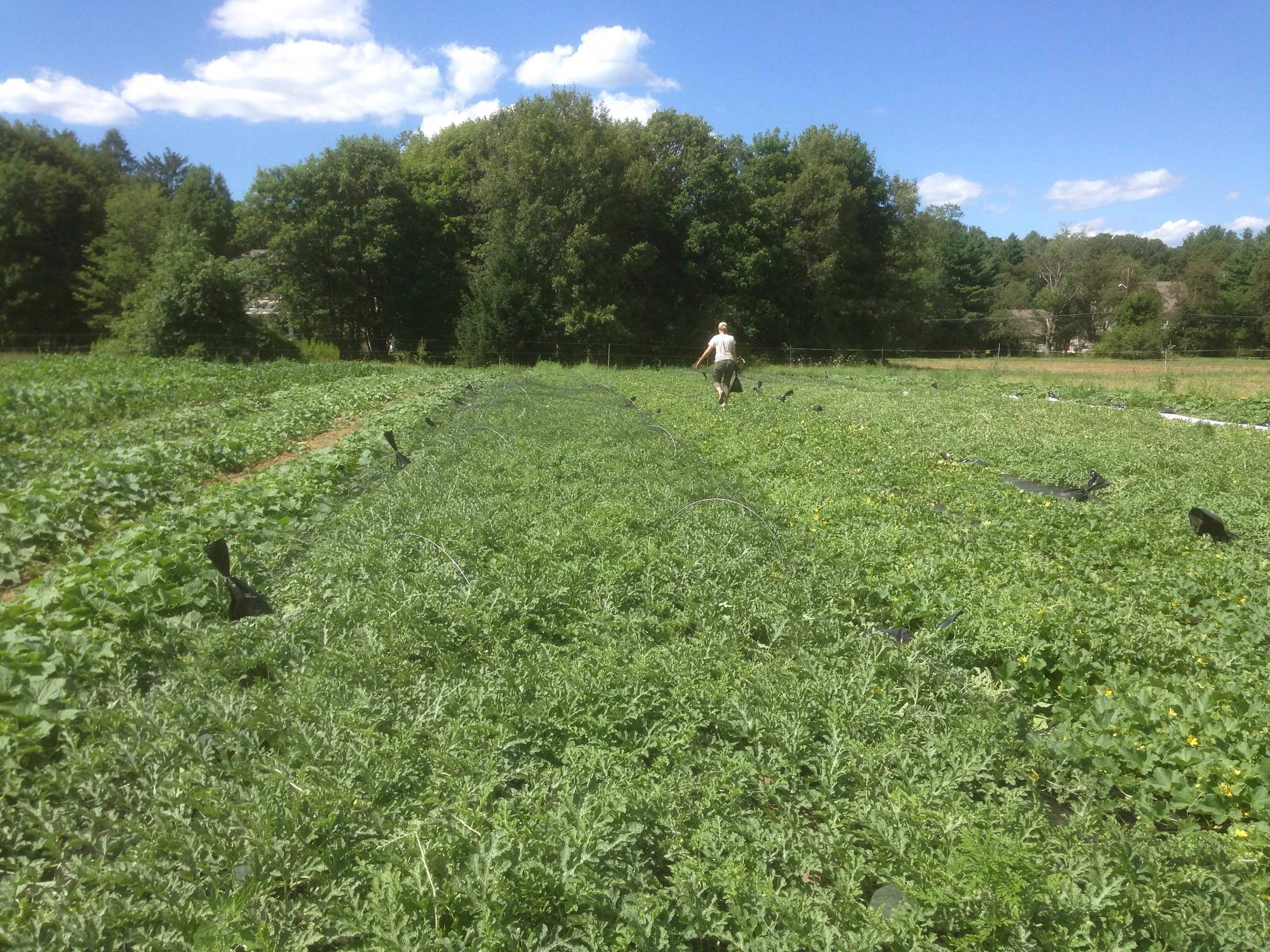 While we appreciate the coyotes' efforts at reducing groundhog, rabbit and mouse pressure on many of our crops, we are not so thrilled about their newly acquired taste for a post-meal dessert! Last week we tried out various strategies to protect the plants and baby melons, but the one that we feel has the most promise involves re-purposing our blueberry netting as watermelon netting. We've also just begun harvesting watermelons in earnest so that we can hopefully enjoy them before the wildlife does. This means that there may be some watermelon that is not fully ripened, but we think slightly under-ripe watermelon is better than no watermelon at all!