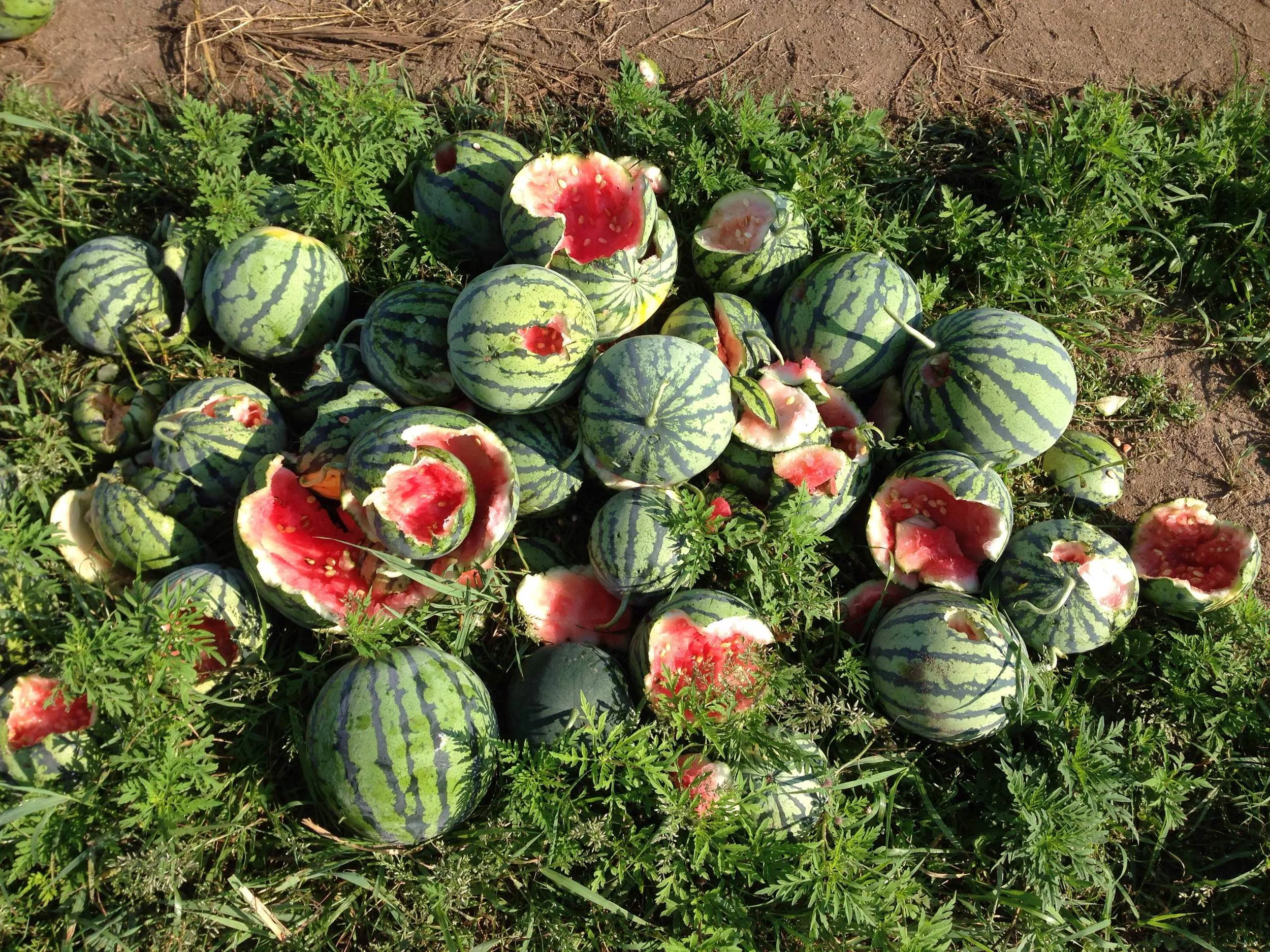 Even more summer crops are ready to harvest this week. The first slicing tomatoes are in, as well as a few heirlooms. Eggplant and peppers are becoming more abundant, and we have also begun harvesting one of our favorite summer treats: watermelon! It is still a bit early for melons, but the watermelon harvest was hastened because of some heavy feeding pressure from crows and our local coyote friends. The crows have been pecking holes in the melons during the day and at night the coyotes have been finishing off the crows' leftovers and appear to be using the unripe softball-sized melons to play fetch with each other.