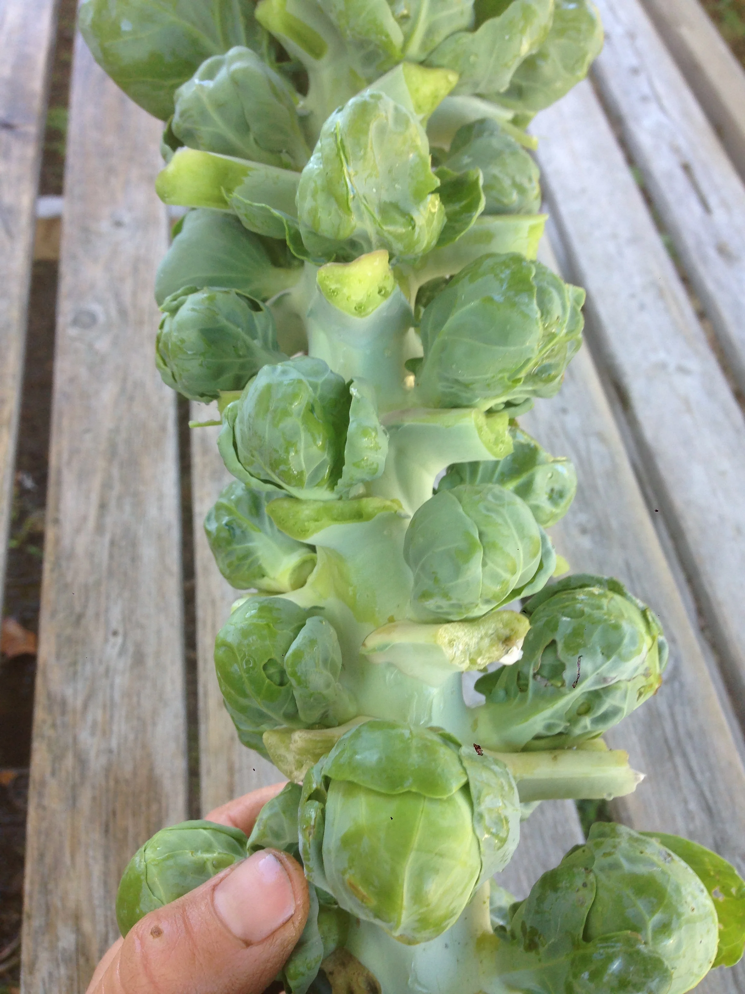Brussels sprouts. We break off the leaves and harvest the whole stalk by clipping it at the base.