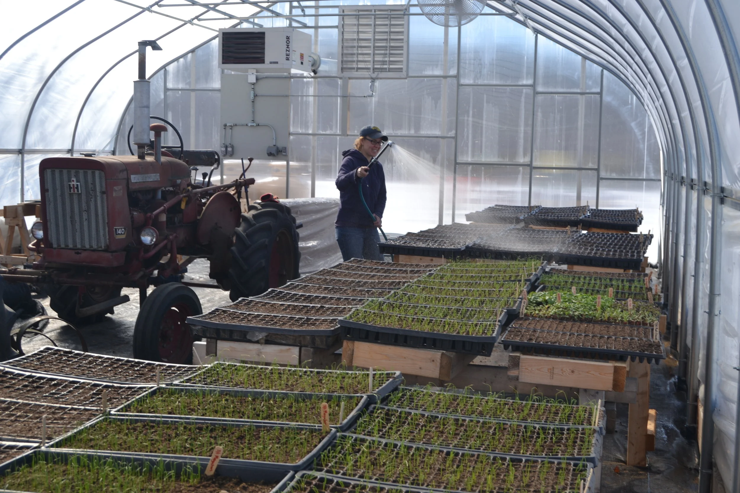 It's mid-March and that means plants are growing in the greenhouse! We started our seedlings in the smaller greenhouse attached to the farm stand because it is more efficient and cheaper to heat. Unfortunately this spring it's been a bit too "efficient" - two Sundays in a row we have walked into the greenhouse only to find that the heater was blowing cold air! Other than our early experimental tomato seedlings, most of our plants appear to have survived the two unheated (and below-freezing!) nights mostly unscathed. After those minor hiccups, we now have all of our seedlings transferred into our larger NEW greenhouse, and it is working like a dream! The onions, shallots, leeks, cabbage and microgreens currently have some tractors for roommates, but as the snow melts, we'll move the machines outside to make way for more seedlings.