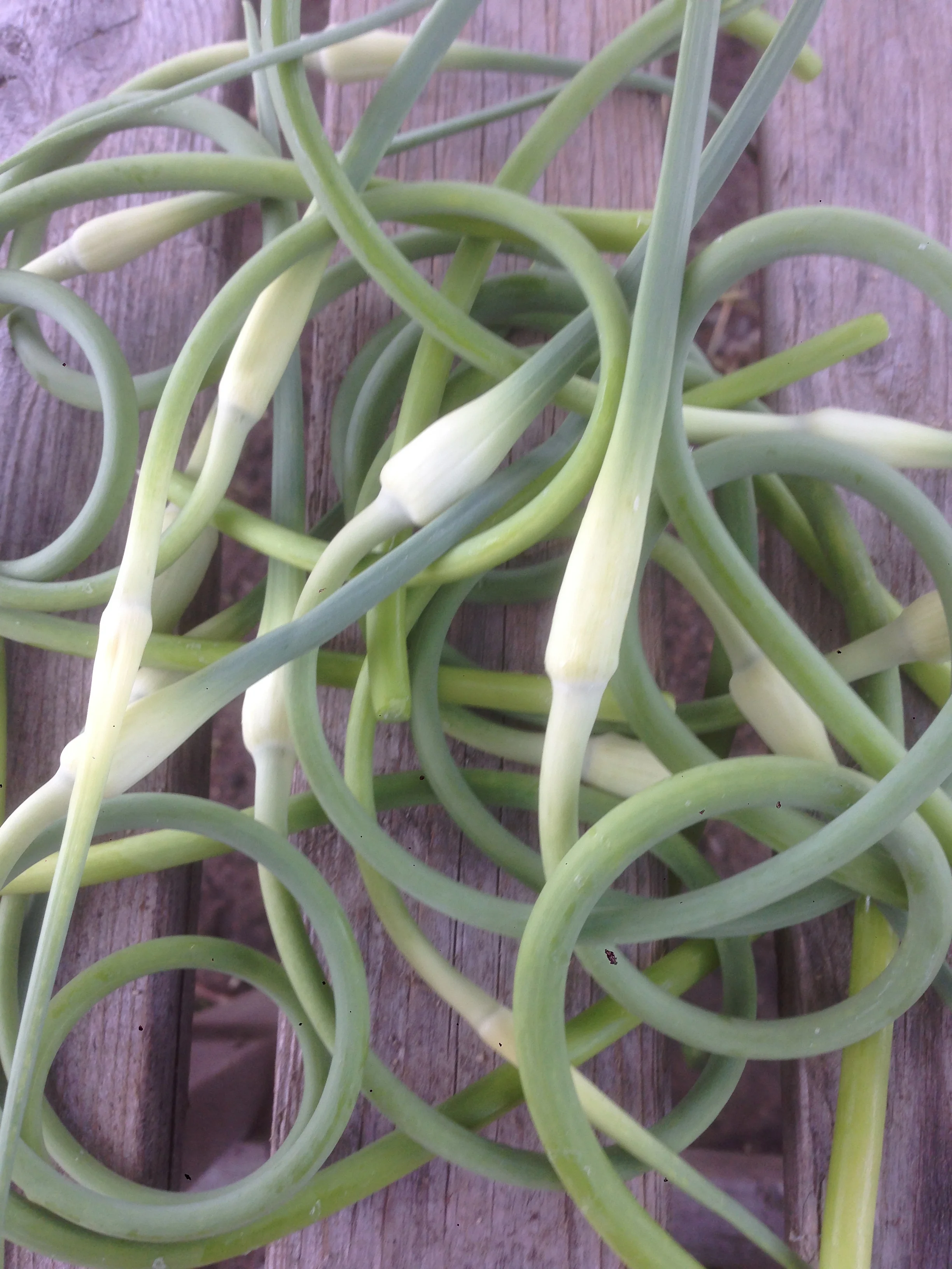 - Garlic scapes - Scapes are the stem and flower of our garlic plant which taste just like garlic with a slightly milder flavor. We snap the scapes off the top of the garlic plants for the great flavor and to encourage bulb growth for the fall.