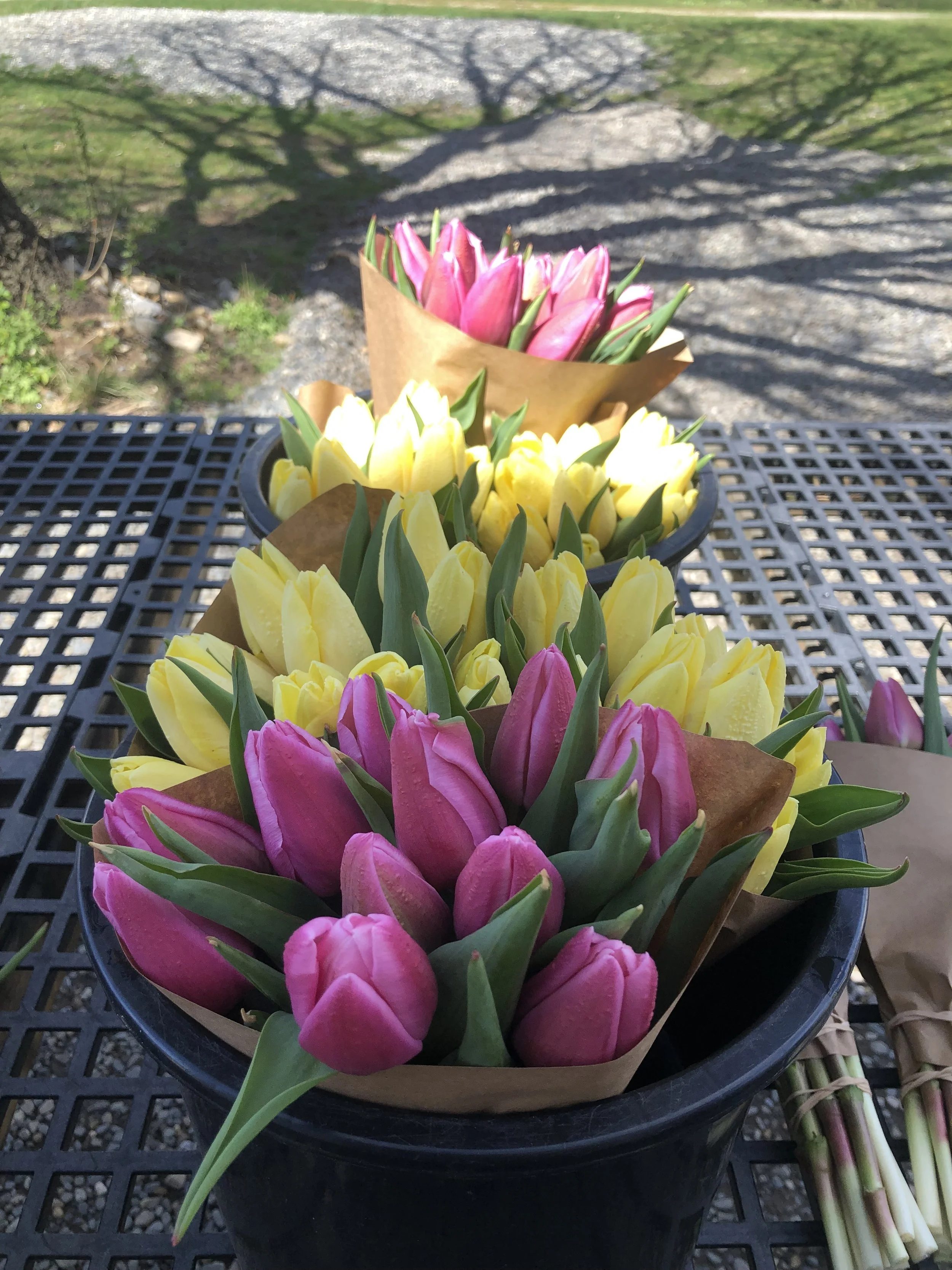 In addition, we have flowers (including Orange Princess tulips and fancy daffodils!), radishes, and extra mushrooms available for pre-orders. Online ordering will open today, Monday April 25th at noon for pick up Tuesday, April 26th from 2pm-4pm and 4pm-6pm (ordering will close at 7am Tuesday). Pick-ups will again be on the porch of our farm stand at 449 Barretts Mill Rd. Concord, MA. If you are ordering and also have a mushroom CSA, we will combine your mushroom share with the rest of your order (please note that pre-order pick-ups aren’t available until 2pm)