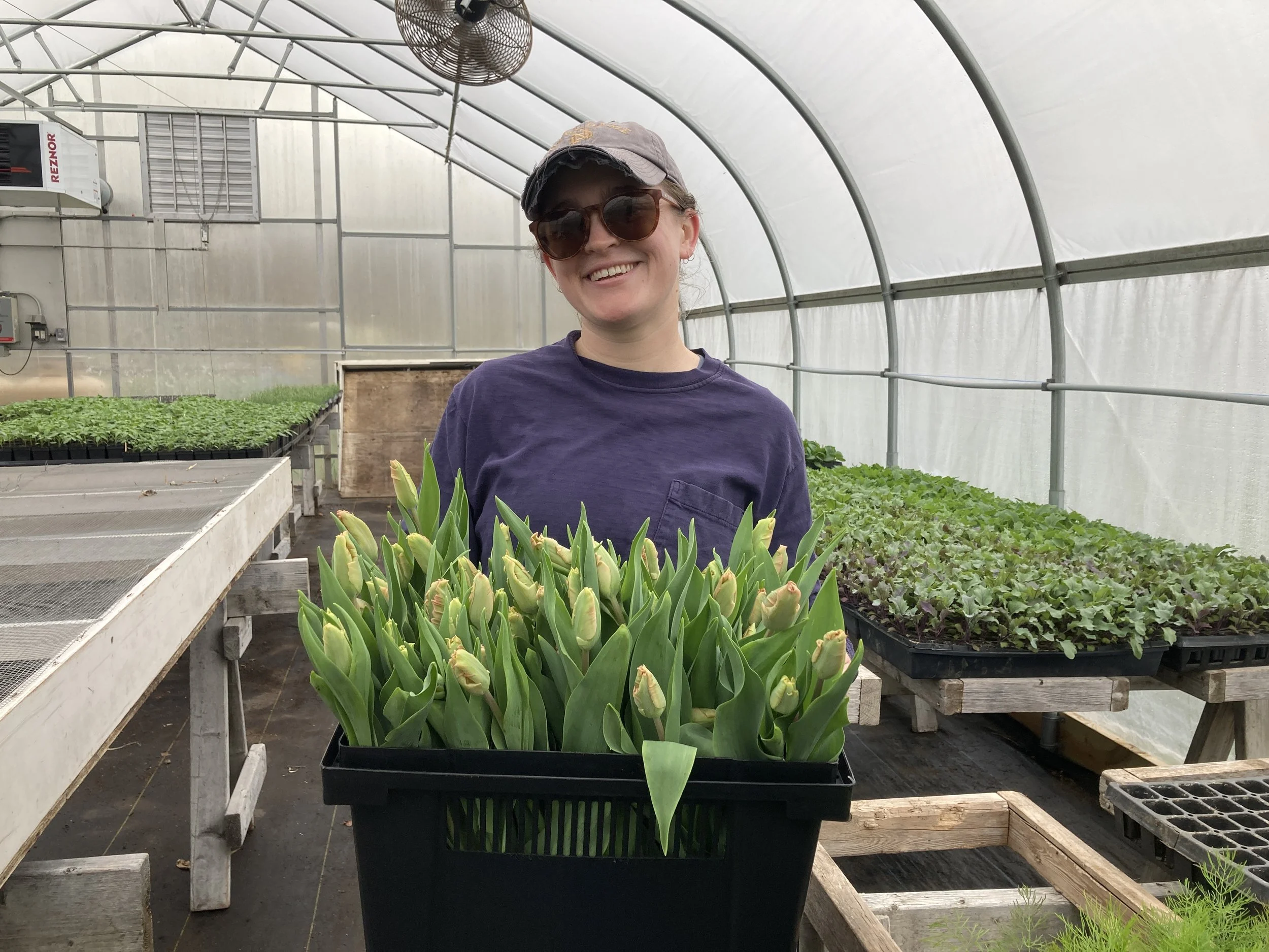 We are excited to have begun tulip harvest, especially because under Catherine’s lead we trialed forcing tulips for the first time. This involved planting the bulbs into crates, which we kept in the cooler with our vegetables all winter before transferring them to the greenhouse with our spring seedlings in March. Now that we’ve tried it, we plan to push it a little earlier for next year!