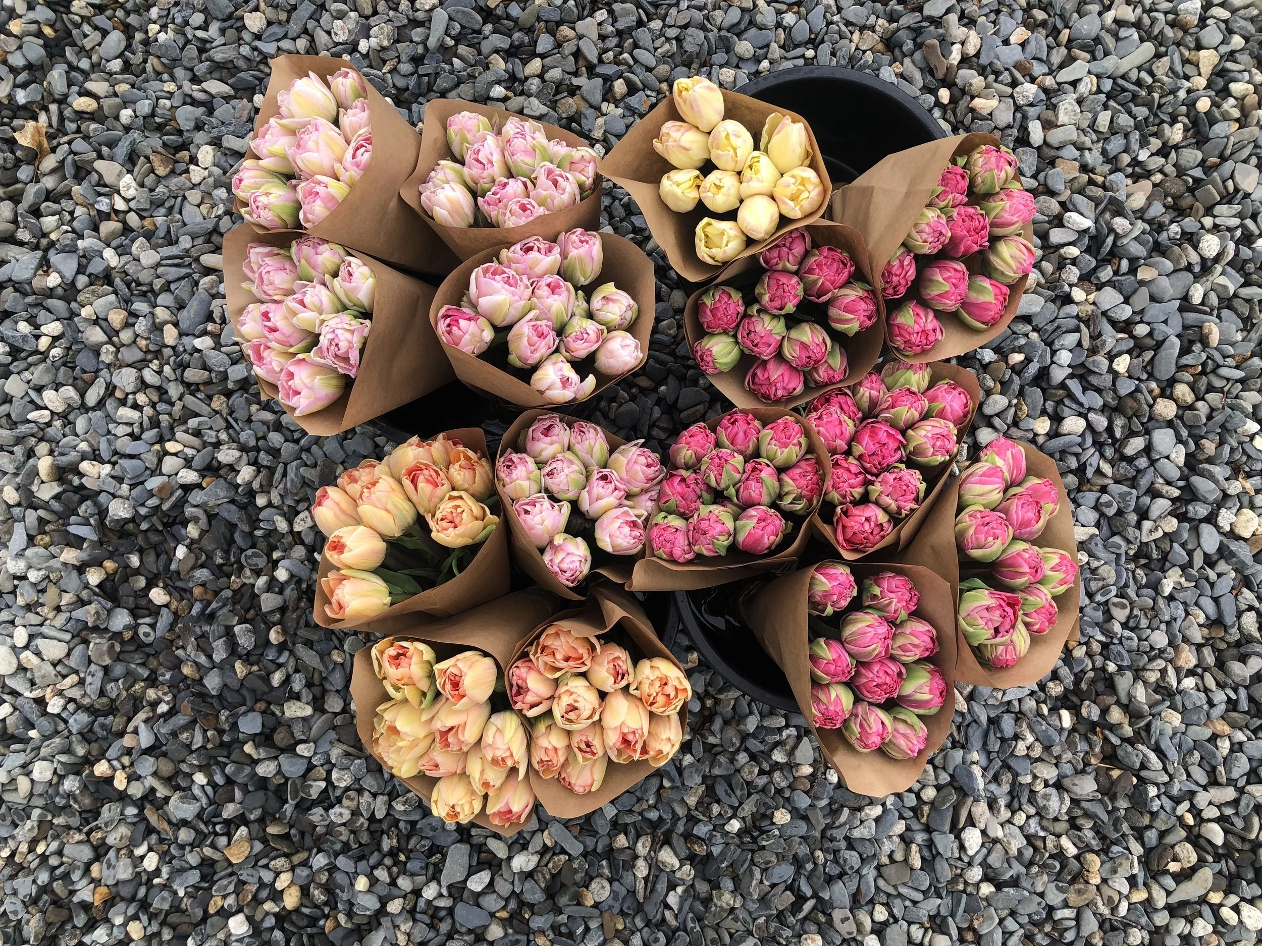 Tulips: Varieties include Menton (rose pink with apricot-pink edges, single blooming type) , Avignon (iridescent red and orange flushed with raspberry-pink and shaded orange towards the edge. Single blooming type), and Blue Spectacle (deep purple, double blooming with tall stems).