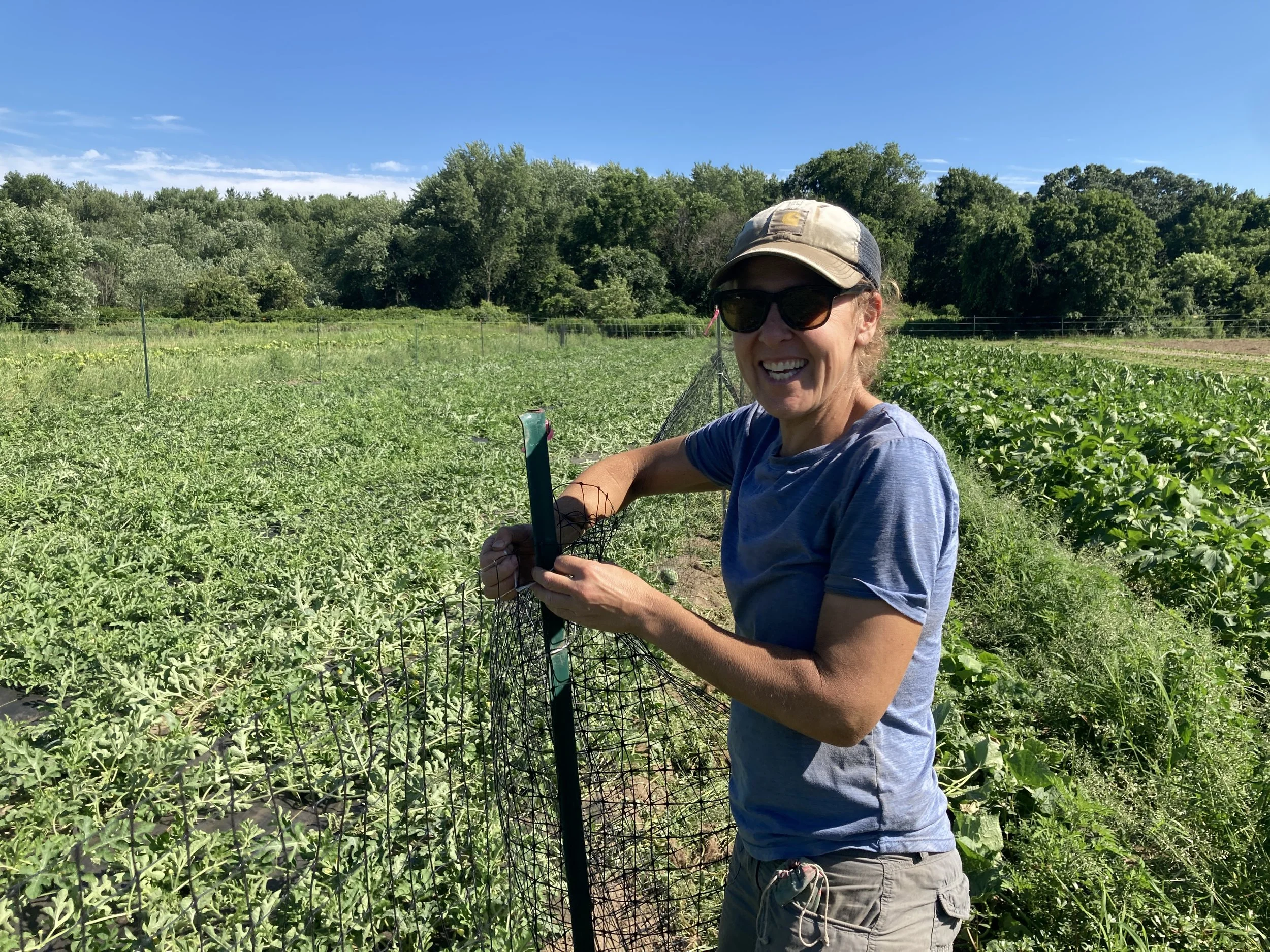 The deer aren’t the only wildlife that are on our bad side, though! The local coyotes have developed a taste for watermelon, and so for the past 10 years or so we have set up a temporary Tenax fence to protect that precious commodity. Rabbits and chipmunks also love to nibble on the tomatoes in our high tunnel, but that seems like (hopefully!) a short-term problem, as the plants are growing quickly and the lower hanging that is within their reach fruit is getting picked out. Don’t get us started on insects like Colorado potato beetle, tomato hornworms, and aphids! It’s certainly a never-ending battle!